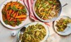 Vegetarian recipes for miso roast leeks with lentils and herby olive sauce, vibrant, green pea spaghetti, and roast carrots with pesto and almonds