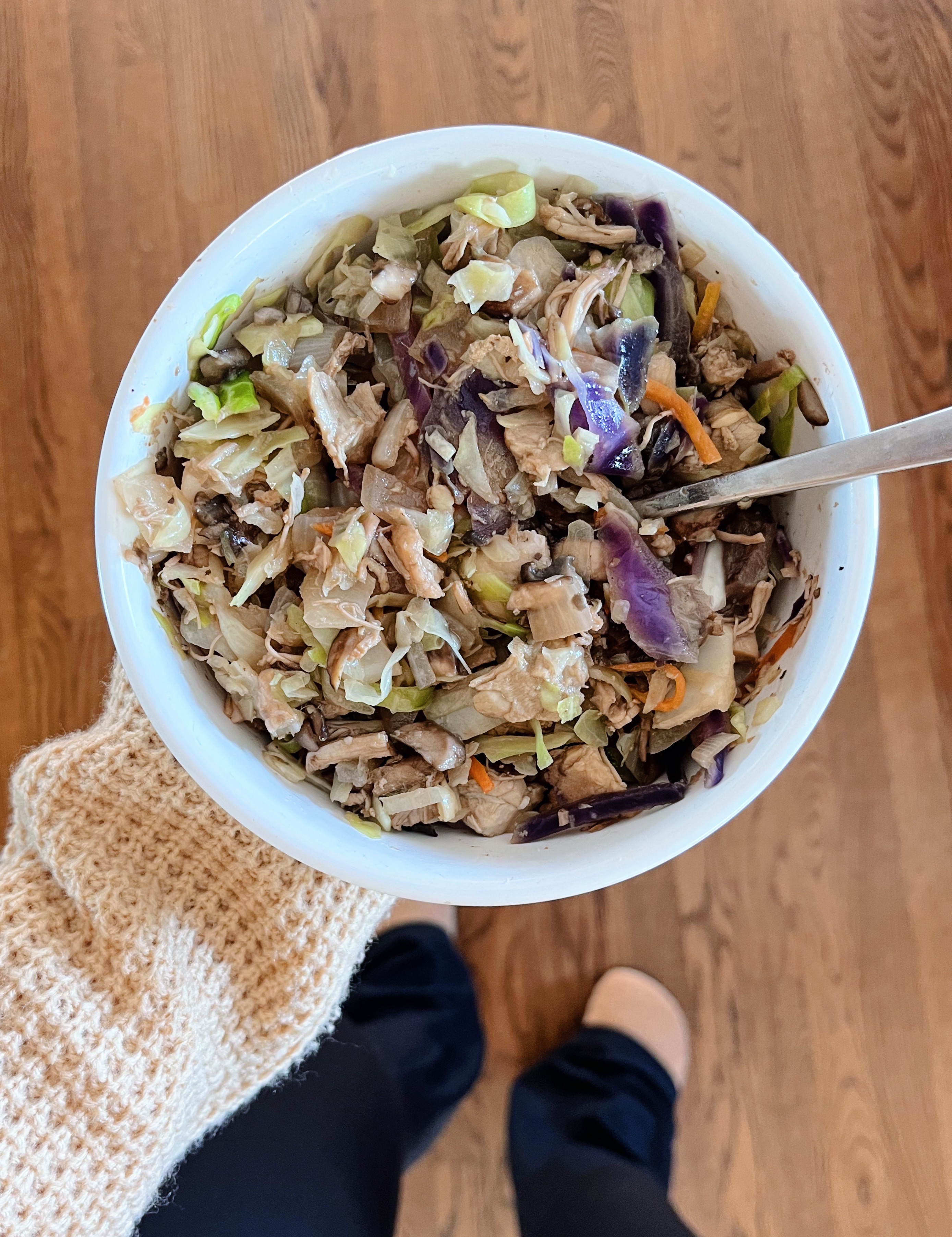 I’ve long said my one pot chicken cabbage bowl with sesame ginger broth is one of the most underrated recipes I’ve shared on my blog. I only has four reviews but all of them are 5-star reviews so it’s small but mighty! When I shared it on Instagram, some DMs asked it it’s similar to the egg roll in a bowl recipes out there and flavor-wise there are similar flavors (ginger, coconut aminos/soy sauce) but it is much more brothy and uses pulled chicken or leftover rotisserie chicken so it doesn’t feel overly similar to me. We enjoyed ours over a bed of brown rice but I also had someone send me a message saying she loves it over egg noodles!