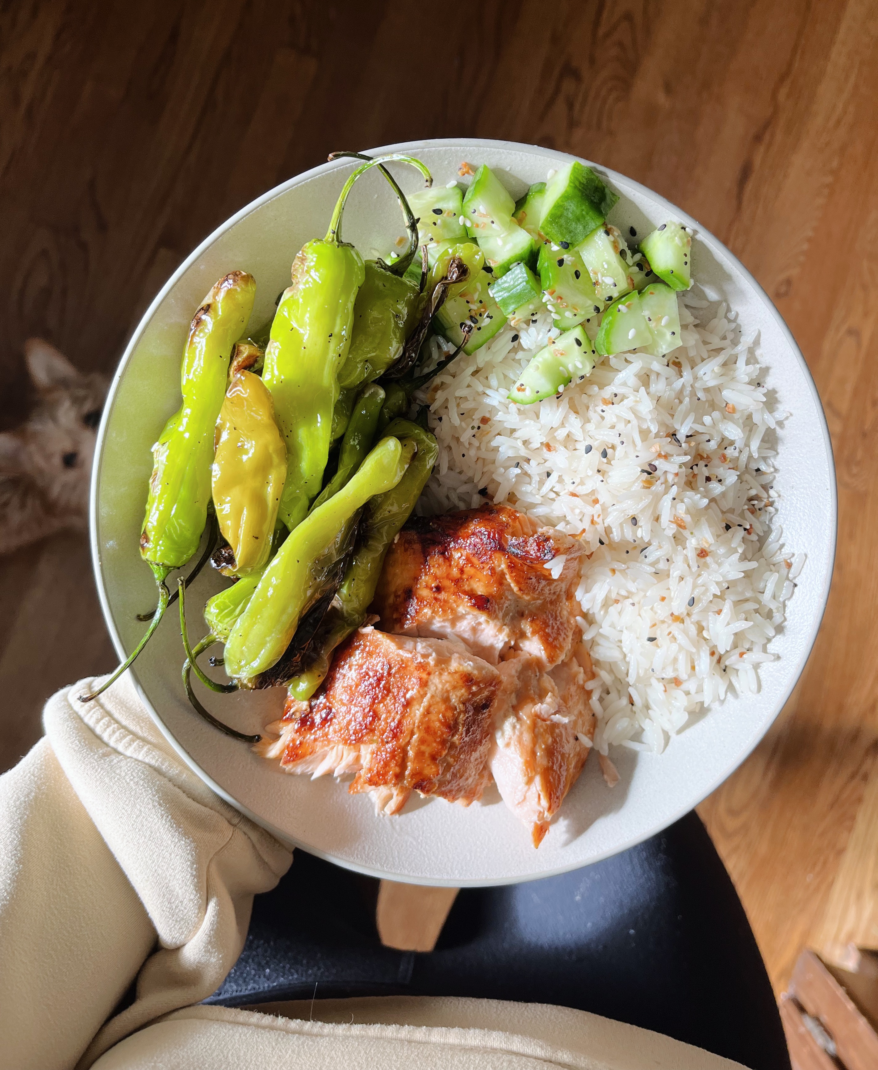 On Thursday evening, I made a modified version of my teriyaki salmon bowls, swapping out some of the veggies in favor of shishito peppers! In our bowls: Teriyaki salmon, jasmine rice and cucumbers topped with Everything Bagel seasoning and blistered shishito peppers. Can you tell Pepper wanted in on this one?