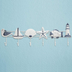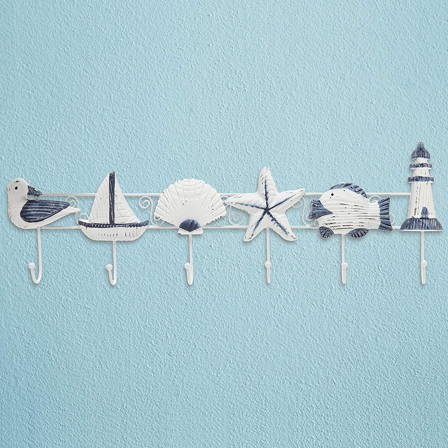 Bring some seaside flair home with this nautical themed wall rack made metal white finish elegant scrollwork design wall-mounted hanging storage boasts hand-painted wooden figures shaped seagull sail boat starfish seashell fish lighthouse beneath each decorative figure lies ball-capped hook perfect storing coats hats handbags towels other items spots hang belongings lovely decorate utility just what need both style any room official mygift product approximate dimensions